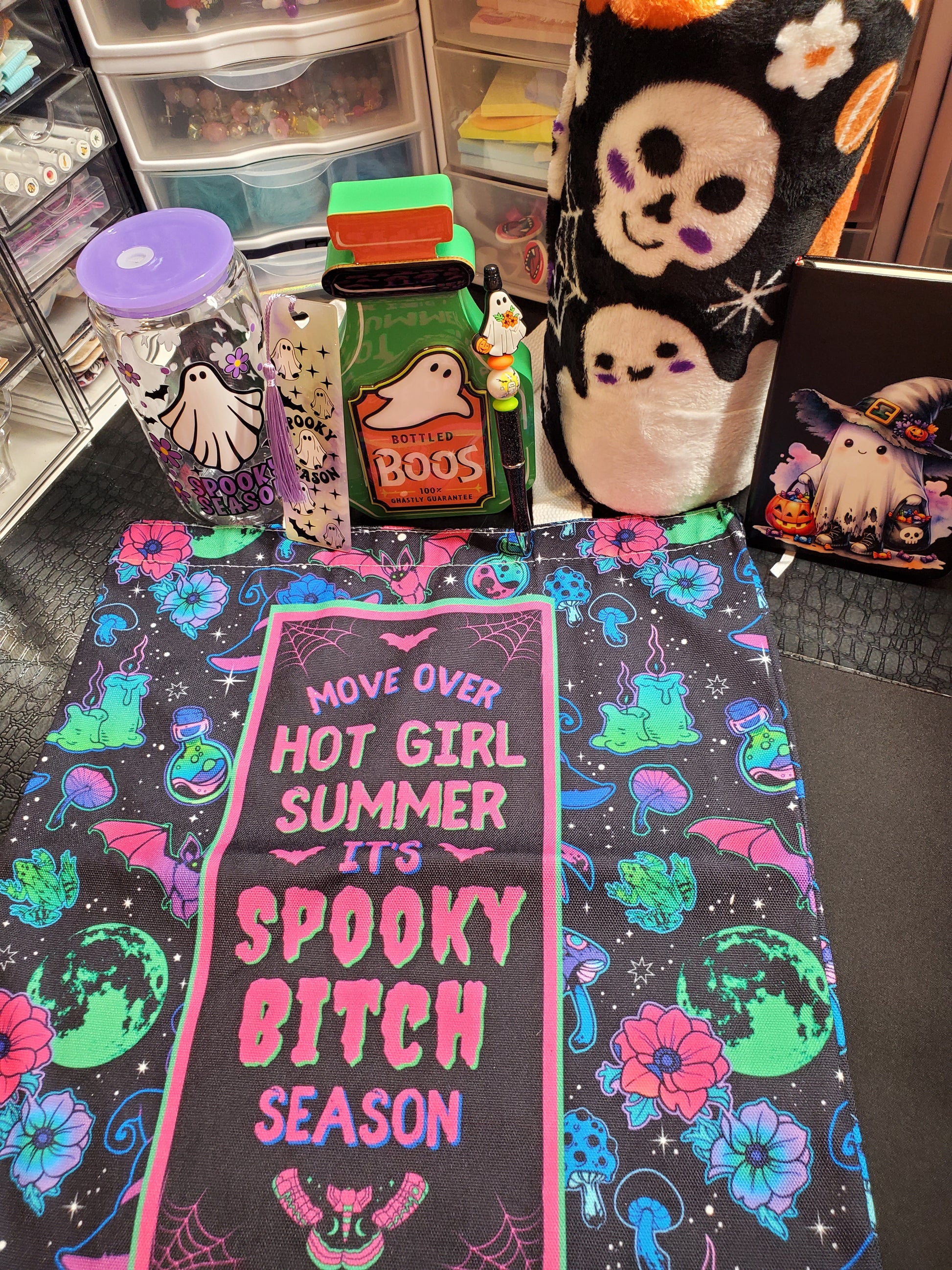 This is a limited bundle and comes with a 16 oz glass tumbler, 50x60 in plush throw, A6 journal, tote bag, beaded pen, acrylic bookmark and shelf decor item.
